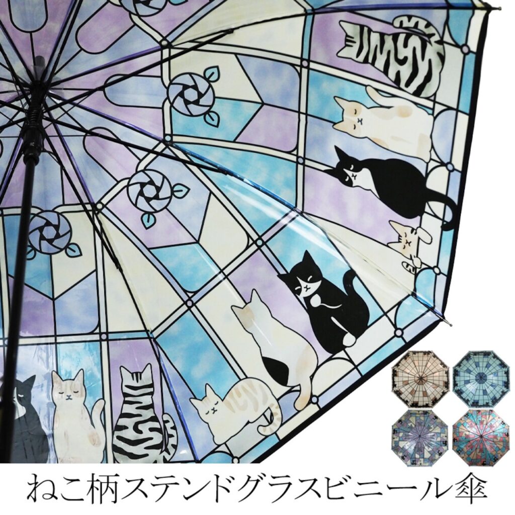 春夏 ねこ柄 ステンドグラス風 ビニール ジャンプ傘 猫 ネコ雨傘