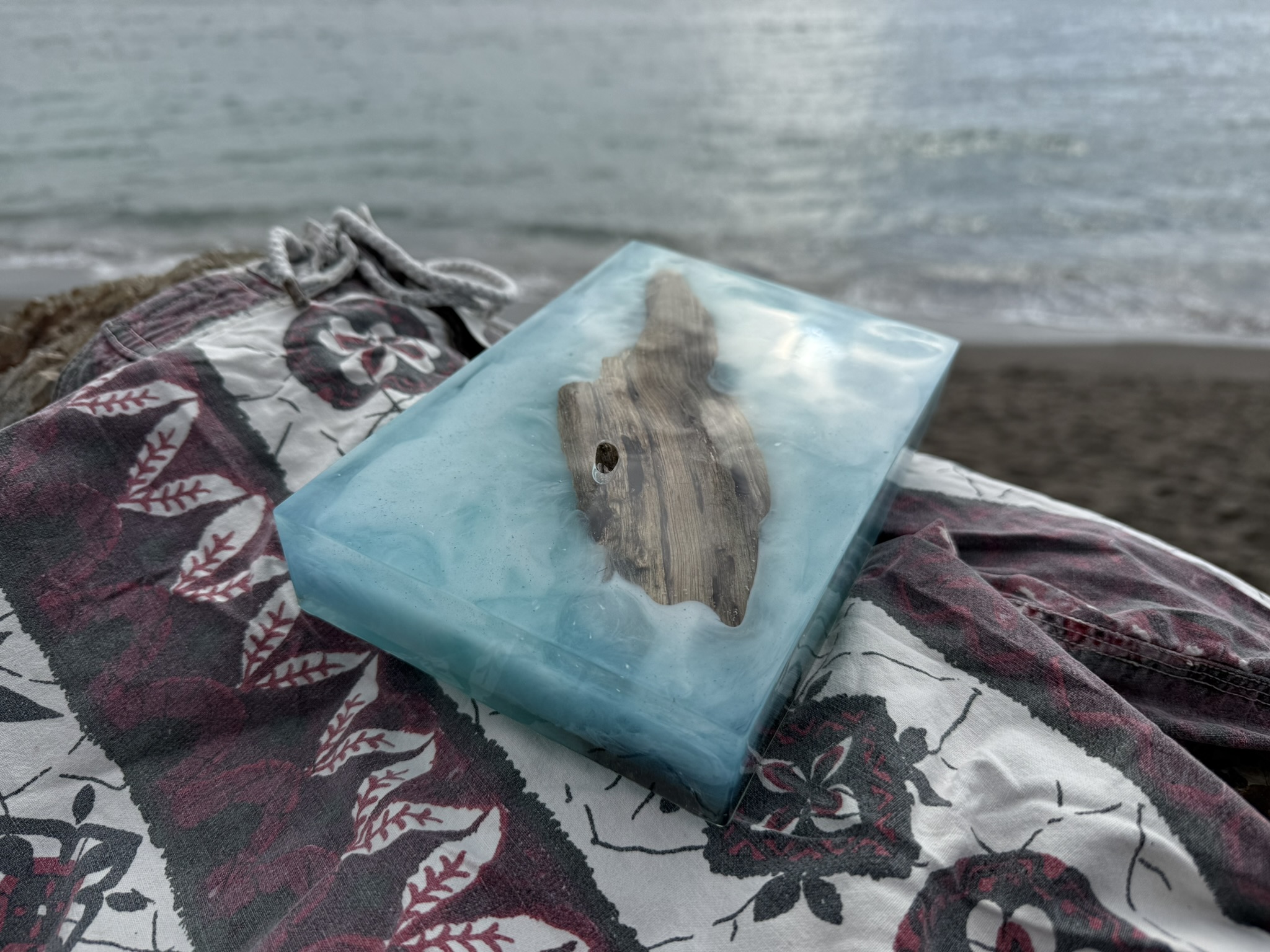 海辺で拾われた流木が、透明な蒼のレジンに包まれて新しい命を吹き込まれました。